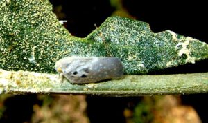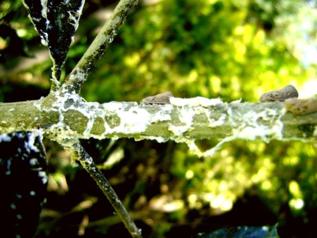 Whitish waxy twigs and leaves? Lots of small gray insects jumping around as you approach your garden? Most probably you are dealing with Metcalfa pruinosa – a citrus flatid planthopper.